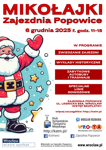 W sobotę 6 grudnia 2025 r. Klub Sympatyków Transportu Miejskiego zaprasza na Mikołajki na Zajezdni Popowice - taki nieco skromniejszy odpowiednik wrześniowego dnia otwartego. Nie zabraknie przejazdów zabytkowymi pojazdami, wykładów specjalistów z zakresu komunikacji zbiorowej i wystawy pojazdów. Będzie można zobaczyć remontowane tramwaje Linke-Hofmann Standard i Konstal N oraz przyczepę autobusową Jelcz PO-1. Zapraszamy na Zajezdnię Popowice w godz. 11:00-15:00.